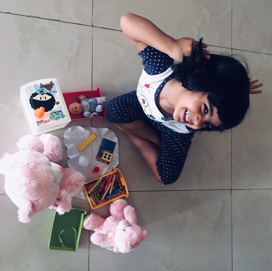 This kiddo is having a gala time with her fluffy friends on a make-believe picnic on a summer afternoon!