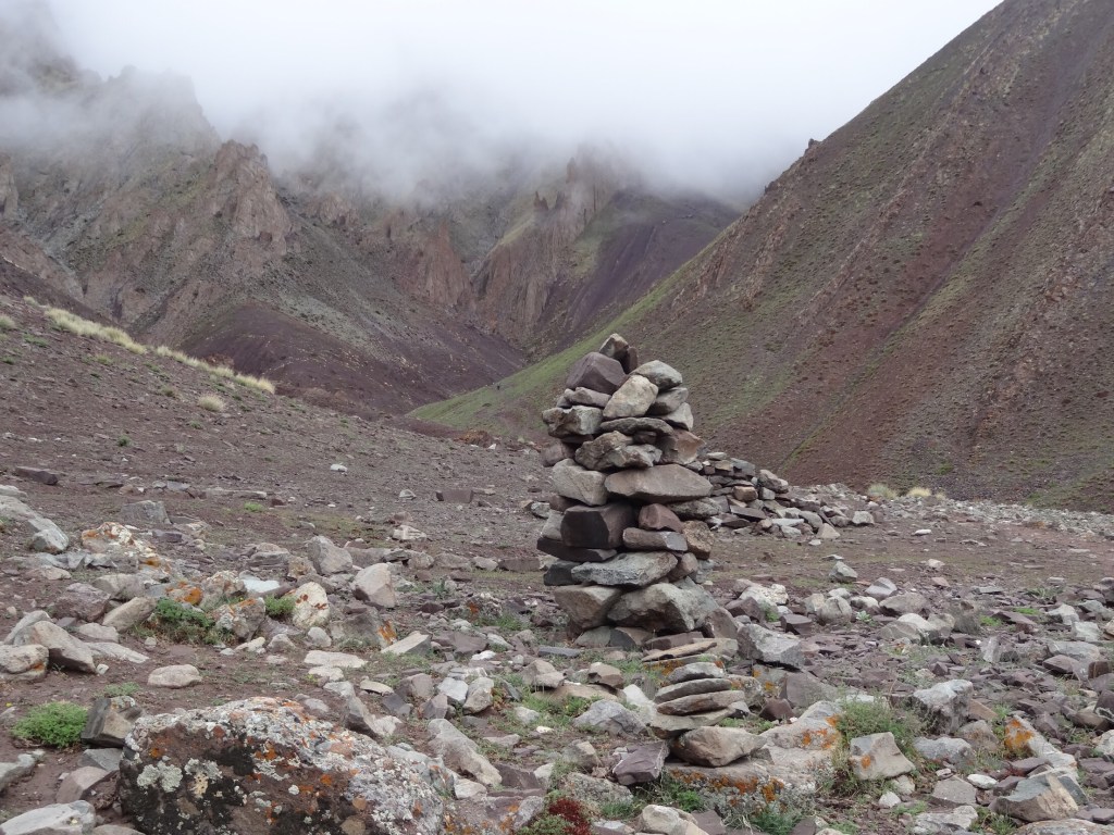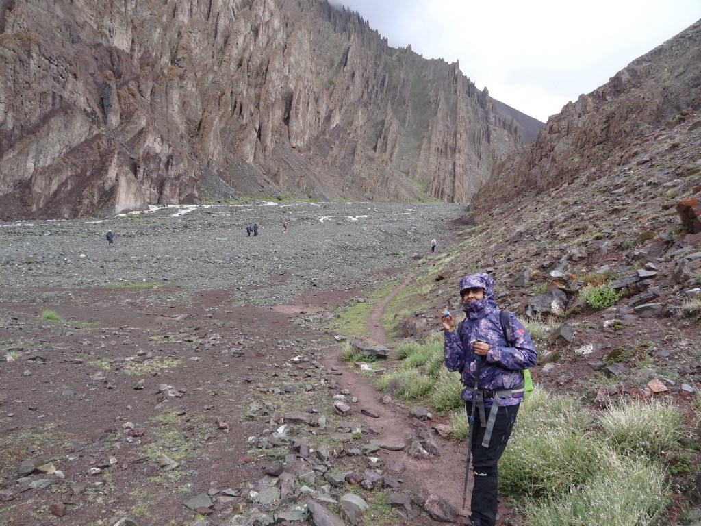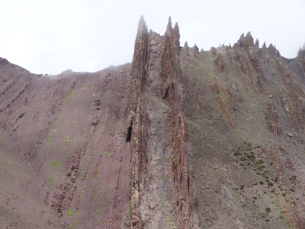 The top point of the pass is a narrow place, hardly enough for all us (and the animals!), no shelter, and highly exposed to the elements. Being quite windy and wet, we chose to click a few snaps, and continue on to the other side. The sandy slope on the decent was lovely, and quite a relief to the feet. The black soft sand just made way while we kept walking down the slope, fast, followed by a stretch of plain walking only to climb a smaller mountain on the other side. However, the views past Stok La was the stuff of tales – reminds you of the pre-historic days of earth, and the various geological events which would have given birth to a terrain and rock structures that we were seeing. Remember the “Hallelujah Mountains” of Pandora in the movie Avatar, and the awe it inspires when you first see them on the big screen? This was way massive, way more awe-inspiring, and way too real! It’s hard to resist staying there for a while, just admiring the strange beauty of what lies bare in front of your eyes. I commented to Rajeev at this stage, “Even if the trek does not have anything else to offer, this for me is enough. I consider this adventure a success already”.