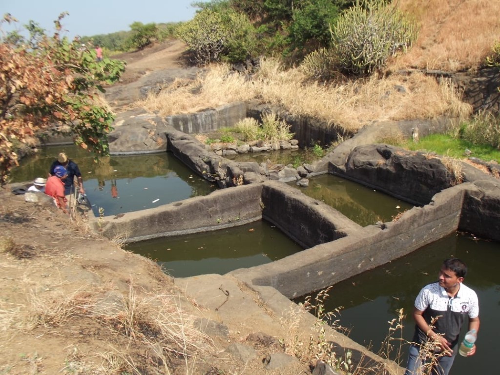 There are 2-3 routes to reach the top, which is marked by a bunch of water-filled cisterns, and we chose the shorter but tougher one. This involved about 40 mins of rock climbing on all 4 limbs. This is harder than the one encountered at Harishchandragadh since the Rick patch goes on and on and could be risky in monsoons.
