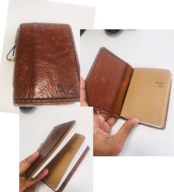 And I have the following pocket passport-sized journal cover for the days I am travelling. It stays in the car glove-box or the car door pocket for the times when inspiration strikes or something worthy of noting shows up (like, an addition to bucket list of places to visit, some addition to the to-do list, or ideas for kids’ activities!). This is actually two “Thoughtslot” refills in a passport sized cover, and remains beautifully bulky, but still convenient to carry everywhere. I generally have a pen clipped in these pages to be sure they stay put together, and I am not left without a pen!