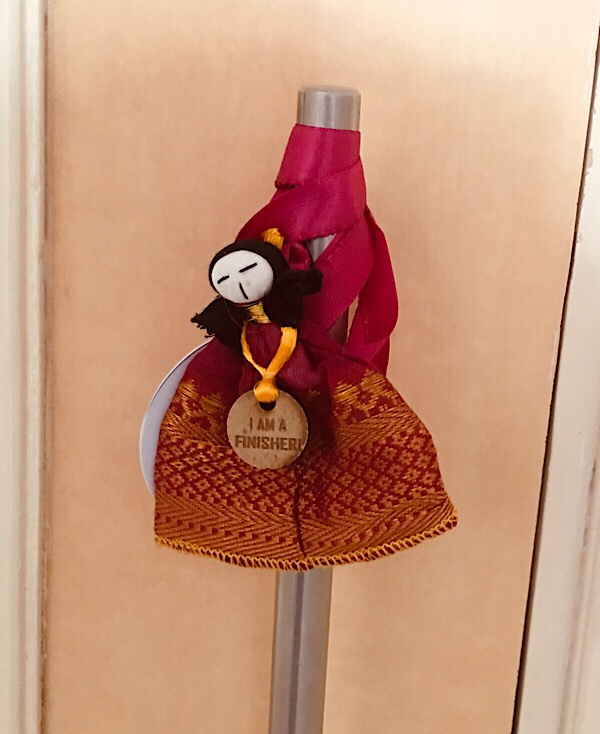 The doll herself is wearing a medal “I am a finisher”, and the door handle is an apt place baby T found for this. Reminds me of finishing any task that I leave home for!!!