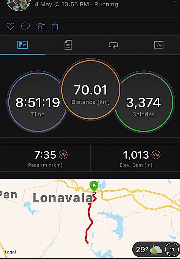 The 70km overnight run in Lonavala! On 5th May with the Striders buddies! Being slow to the point of embarrassment is now a hallmark of my marathon journey. But my endurance is good, and I will keep pounding the pavement for 20 more kms in a month’s time!