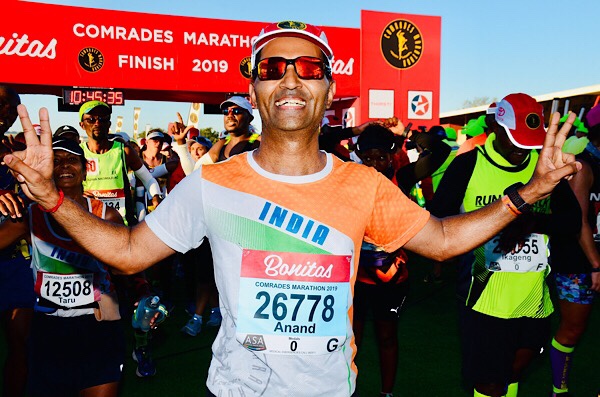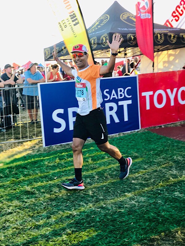 Having met my cut-offs, give or take a few seconds, after the top of Polly Shortts I decided to let loose and give my best to the last 7k or so remaining in the race. This turned out to be my best lap during the race! Towards the finish, when the race entered the race course in Pietermaritzburg, my legs found a new strength…smiling and waving at my wife Veena – the pillar of my support during this arduous journey, who was standing in the stands cheering me on – I made a final dash to the finish line. At the finish line, It was the most emotional finish line I have had…