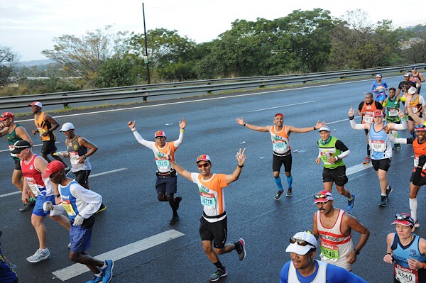 Less than 5k into the run, we saw the legendary Barry Holland running ahead of us, with the medal count of 46 on his bib! I pointed that to Aniket excitedly, and a co-runner mentioned that Barry is a legend in Comrades circles – not only has he done 46 successful runs, he has done them all consecutively…not missing a single year! A little later, while climbing a flyover, Neha asked us to slow down…saying “dheere dheeeere guys” and another runner picked up her words and started singing “dheere dheere se meri zindagi me aana…”…reminding ourselves to take it easy – dheere dheere – during the first half of the race. “They don’t call me Kishore Kumar for nothing” he quipped, not realizing that this song was performed by Kumar Sanu. It was so much fun continuing to hum that song for a while, and then picking up other running-related Bollywood songs, like “ruk jaana naheen tu kahi haar ke” and “chalte chalte mere yeh geet”! We made another Indian runner named Shivshankar, and, obviously, we burst into the song “Jai jai Shiv Shankar…”. Oh what fun!